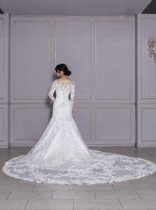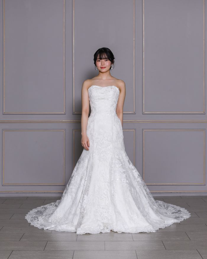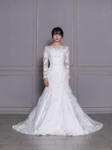 全身に繊細なレースの刺繍が施された優美なデザインのマーメイドドレス。透け感のあるロングスリーブで淑やかでエレガンスな雰囲気をプラスします。