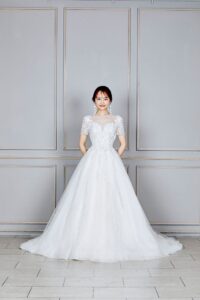 胸元から肩にかけてちりばめられたビジューで特別感を演出。繊細なシルバーラメの刺繍で360°輝く衣装です。