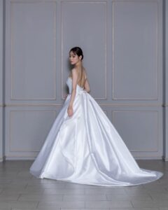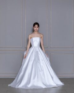 純白の正統派なボリューム感で花嫁様らしさを引き出してくれる1着。立体感と曲線美を兼ね備えた格式高いエレガントな雰囲気を演出します。