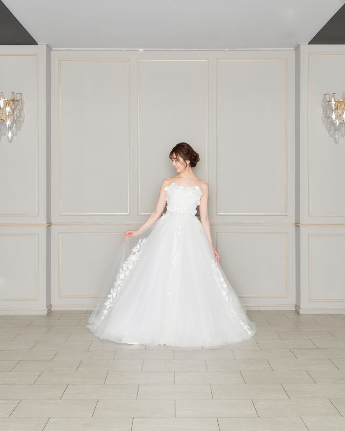 柔らかい生地が何層も重なったふんわりシルエットでピュアな雰囲気に。裾にかけて施された美しいお花の刺繍でナチュラルさをプラス。
