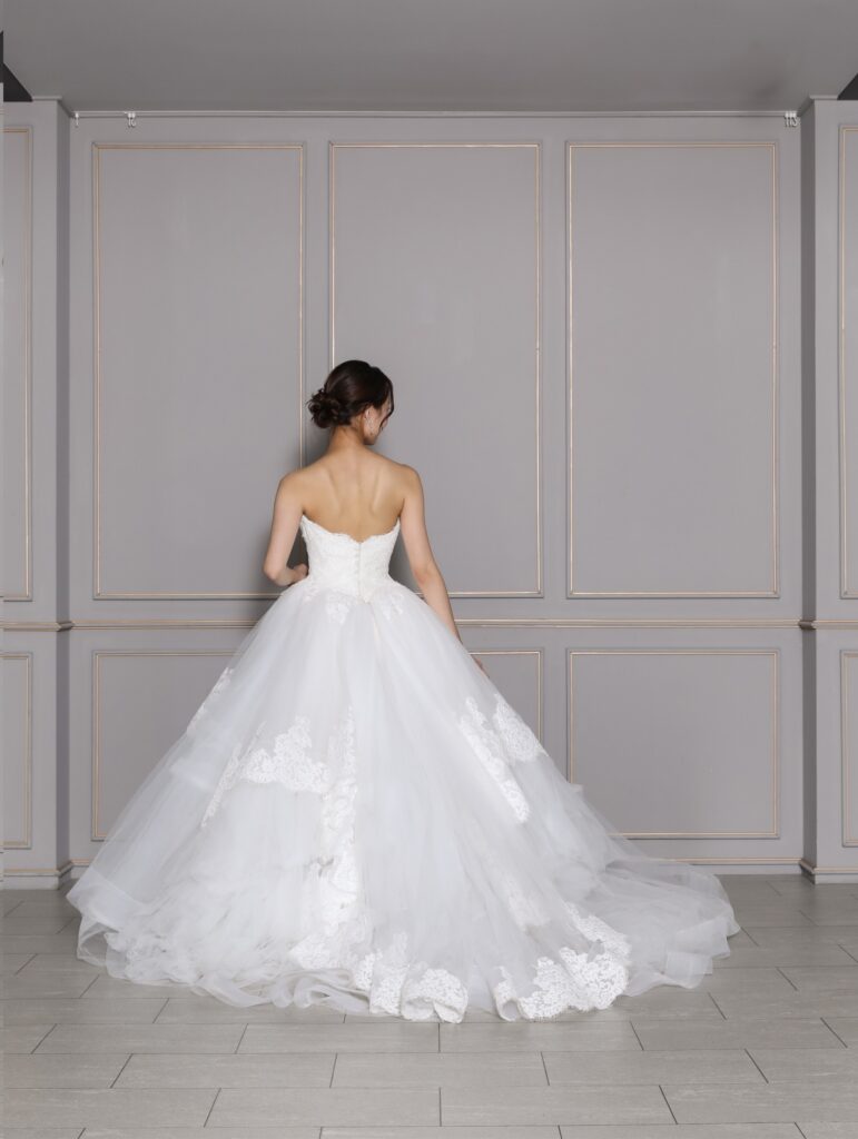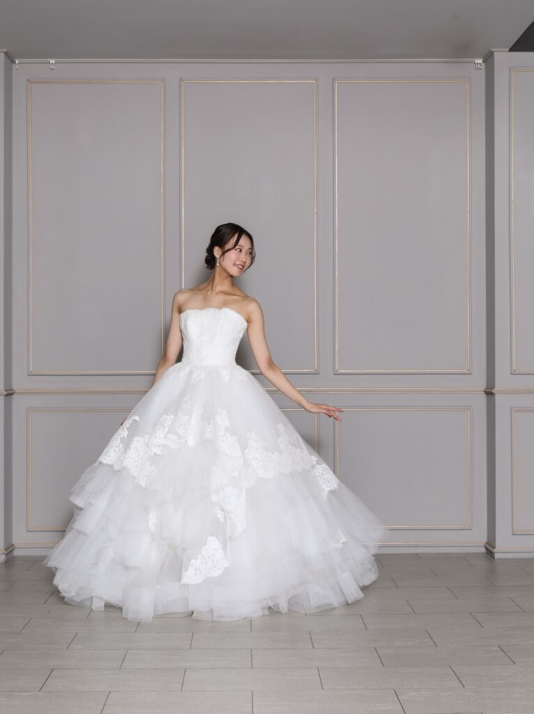 繊細な刺繍と柔らかい生地を何層にも重ねたティアードドレス。柔らかいボリュームはプリンセスのような存在感を演出します。