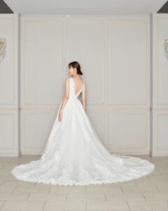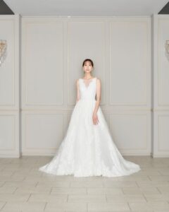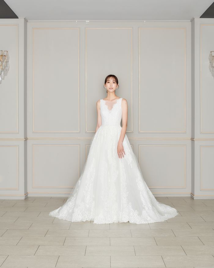 ふんわりとしたレース刺繍が特徴。細部まで丁寧にレース刺繍が施されており、上品な華やかさがあります。派手過ぎず、控えめながらも存在感のあるデザインで、デコルテのVネックはより女性らしさを引き立てます。