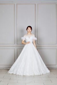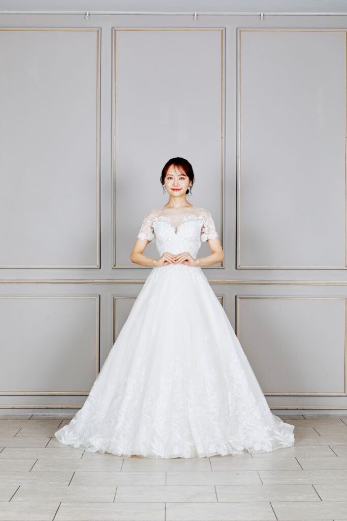 胸元から腰に掛けて華やかなビーディングが施された一着。スカート部分にはお花の刺繍をあしらい可愛らしさも演出。