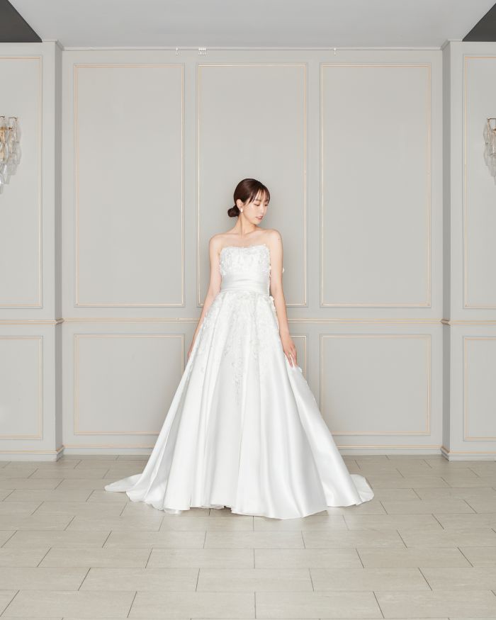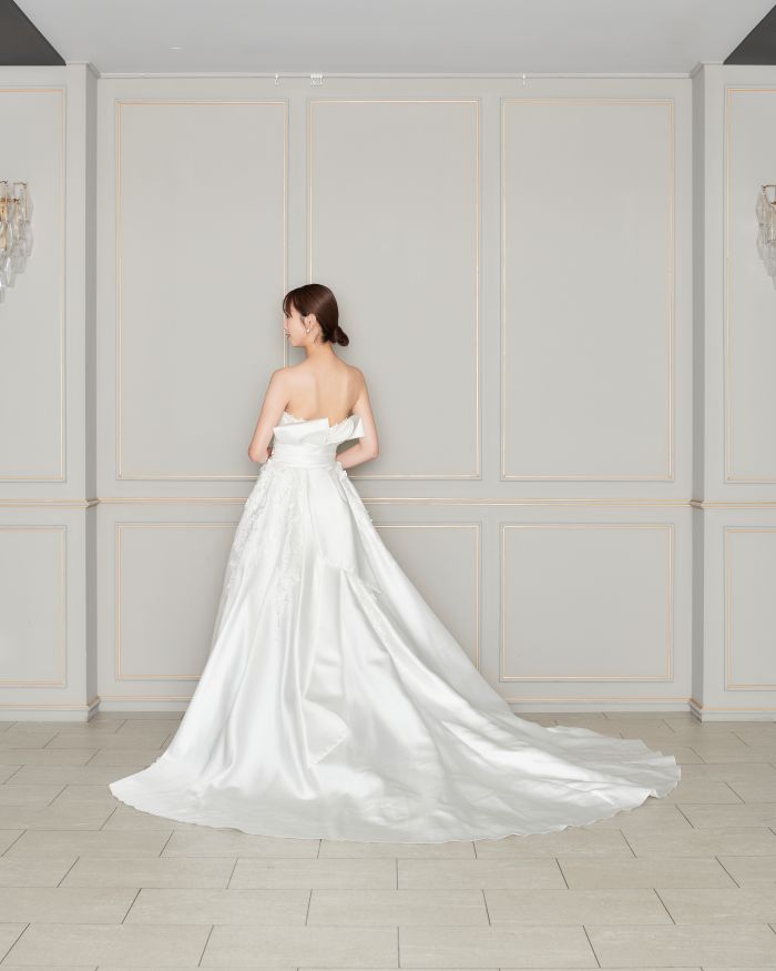 立体的な花モチーフとバックの個性派リボンが可愛らしさを演出。純白の張りのある生地とドレープのスカートが大人な印象を加え、スウィート×エレガントがミックスされたデザインです。