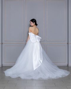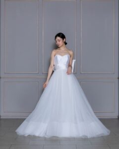 ミカドとチュールがミックスした透明感あふれるデザイン。バックのリボンがより女性らしい美しいシルエットを引き出します。着用した際の透明感や清楚感は他では味わえない一着です。