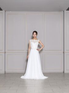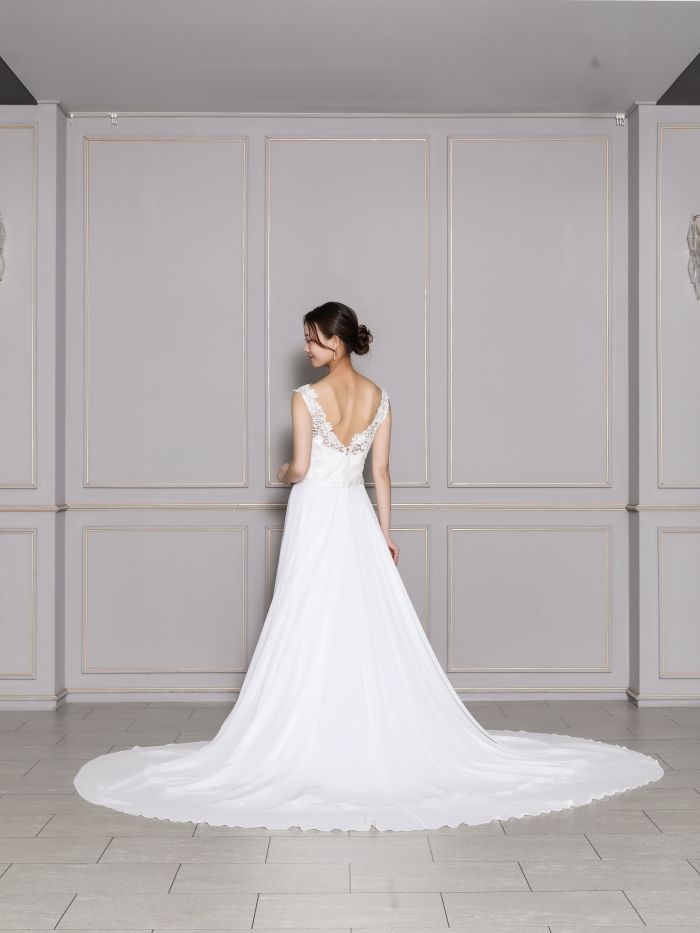 胸元の繊細なレースで可憐さを演出。背中のVカットが女性らしさを引き立ててくれます。