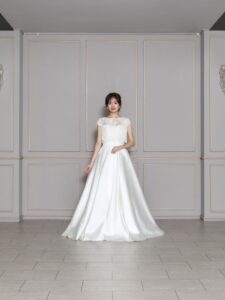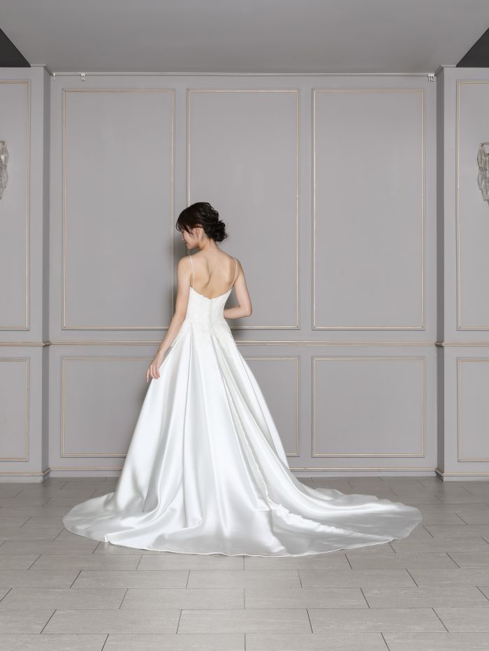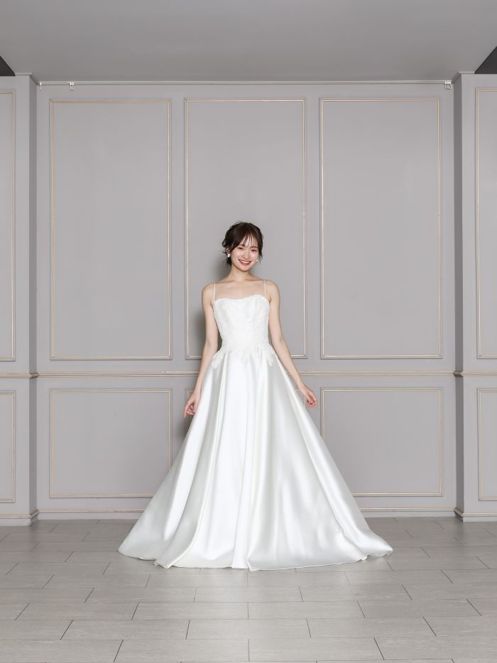 サテンの上品な素材感を使用し、クラシックで高級感のある印象に。レースのボレロを着ることによって、ナチュラルなガーデンにも合うドレスに早変わり。結婚式や前撮りでも活躍する一着です。