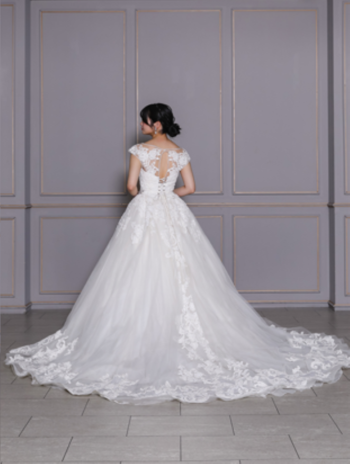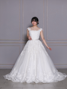 バストから裾にかけて、全体がパールのビーディングに覆われた華やかな一着。オフホワイトの色味は柔らかく可愛らしい印象を与え、チュールが重なってボリュームのあるスカートは主役感を演出。ノースリーブの袖でより華やかさが際立ち、シーンに合わせて取り外し可能です。