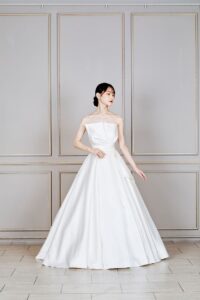 バストからウエストにかけて絞られていくようなリボン型のタックデザインが、ウエストをすっきり魅せてくれます。シンプルながらも個性溢れる一着は、どんなアクセサリーとも相性抜群。