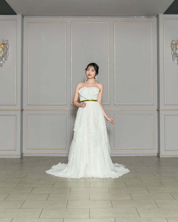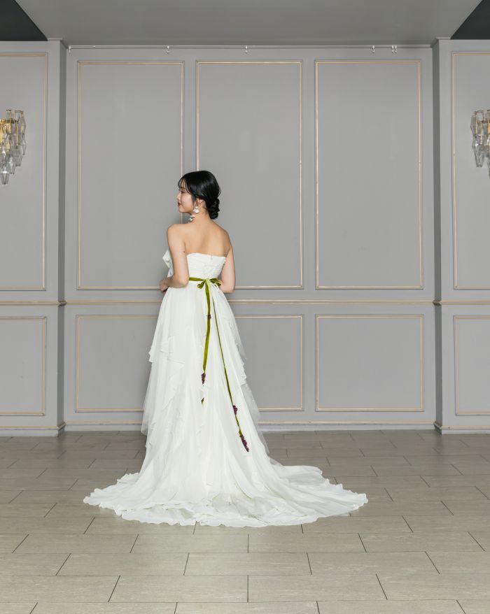 ソフトなティアードのスレンダードレス。グリーンとパープルのお花のようなサッシュがアクセントとなりナチュラルな雰囲気に。