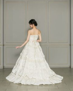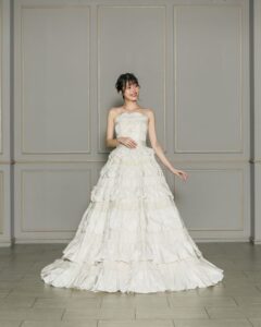 ギャザーを寄せたふんわりシルエットのは中世ヨーロッパのドレスのような気品があります。オフホワイトの色味と胸元のリボンのデザインで可愛らしさも兼ね備えた一着。