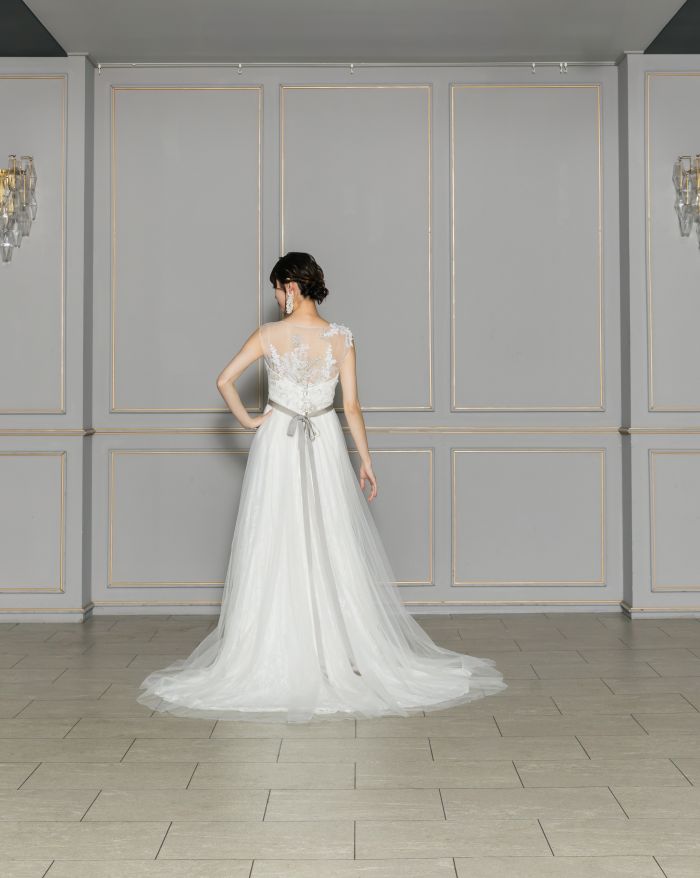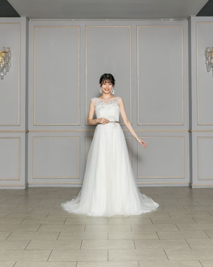 繊細なレース刺繍でフェミニンなさを演出。着脱可能なロングスリーブはシーンに合わせて印象を変えられます。