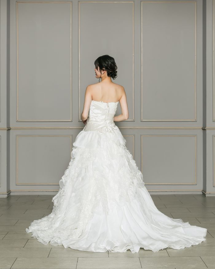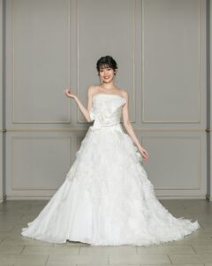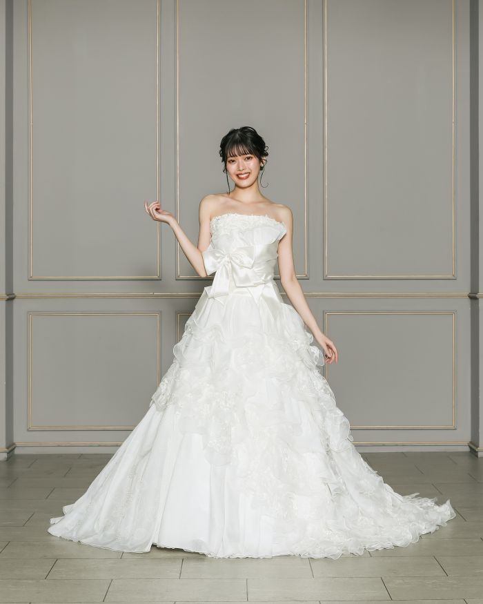 繊細なチュールと立体的なフリルが花びらのように重なり合う華やか一着です。