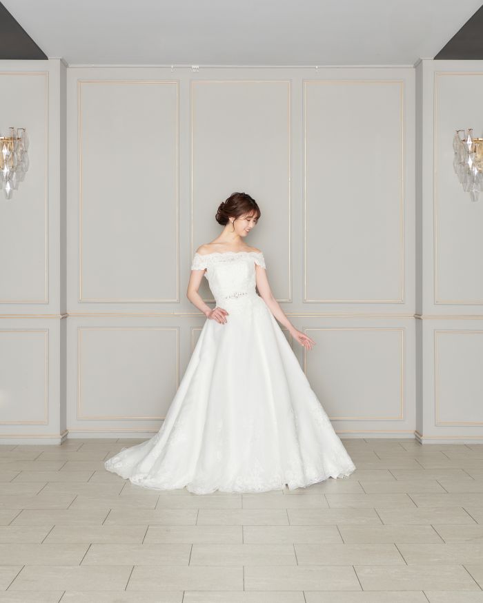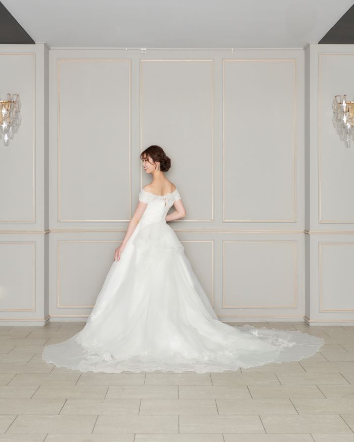 レースのオフショルダーがデコルテを美しく引き立てくれる一着。後ろのふわふわモチーフで華やかさをプラス。