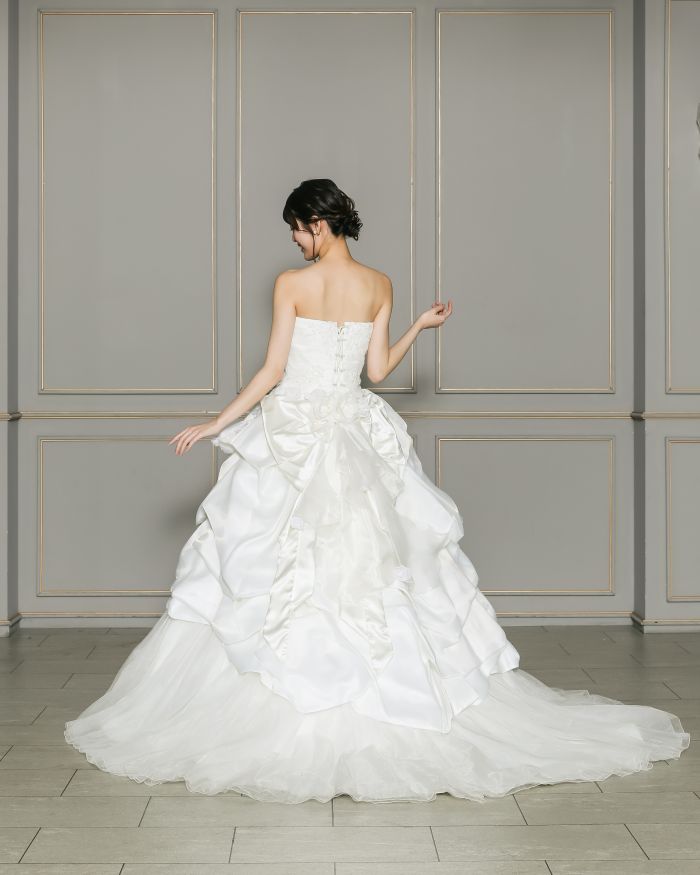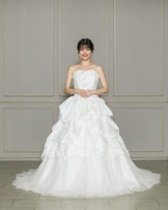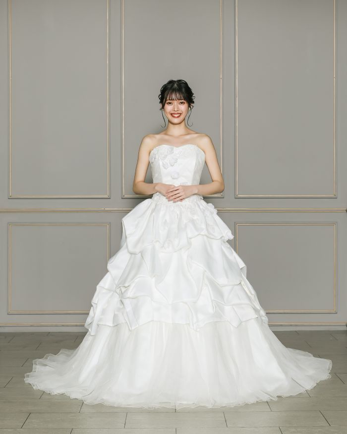 ふんわりと重なり合う立体的なフリルが美しく広がるプリンセスラインドレス。ボリューム感のあるスカートが華やかで可憐な印象を演出し、花嫁様を一瞬で主役に引き立ててくれます。