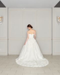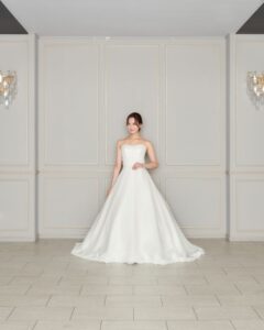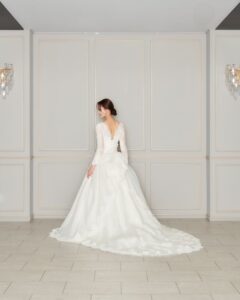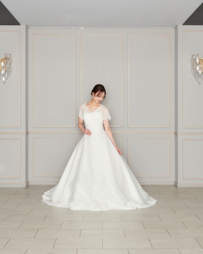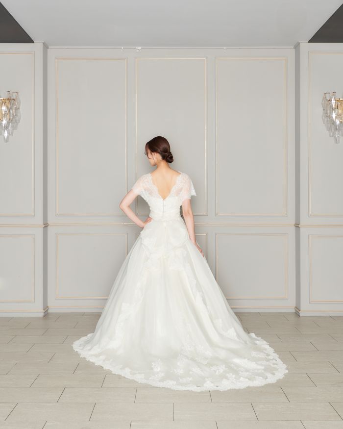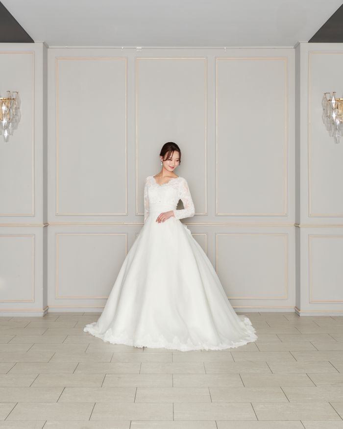 取り外し可能なお袖が2種類ある3Wayのウエディングドレス。シーンに合わせて自分好みのスタイルに。上品なレースのお袖が上品でクラシカルな印象にしてくれます。