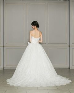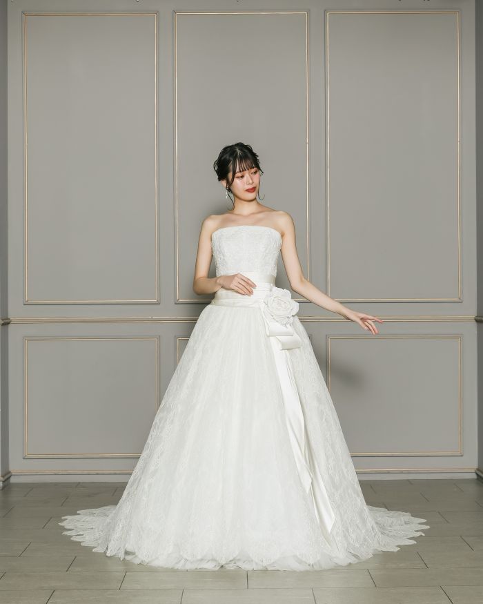 お顔を華やかに見せてくれる胸元のビーディングにスカートは総レースの上品な一着。ウエストマークのコサージュがより一層華やかに。