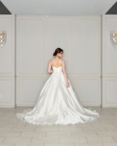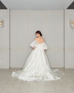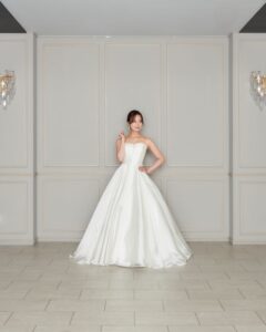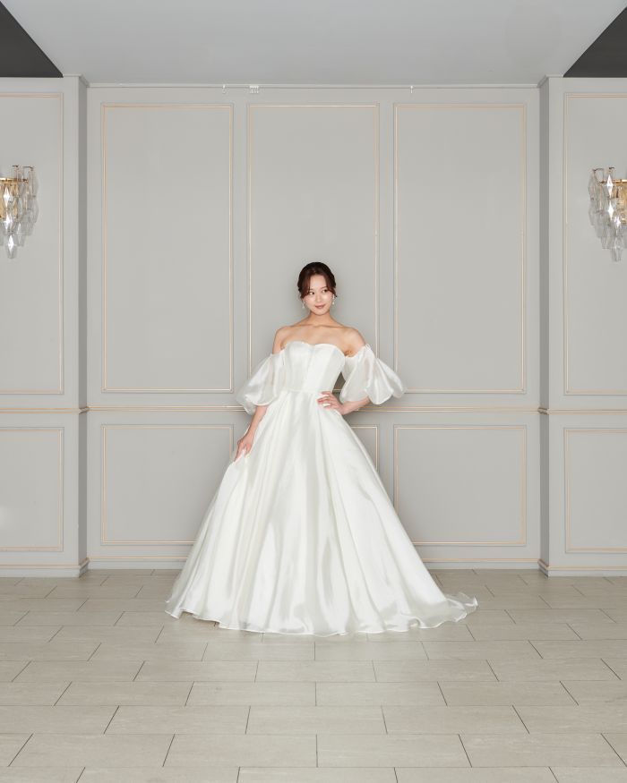透明感とハリ感が合わさったオーガンジーの生地感で、上質さと可憐さを兼ね備えたデザイン。ボリュームのあるパフスリーブが、シンプルながらも存在感を演出します。
