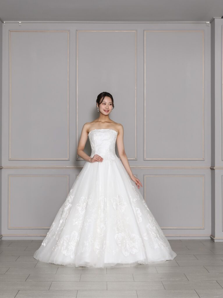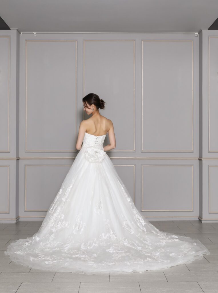 大柄で華やかな花刺繍はドレス全体に立体感を与え、着る人の個性と存在感を際立たせます。特別な日にふさわしい華やかさを引き立てる一着です。