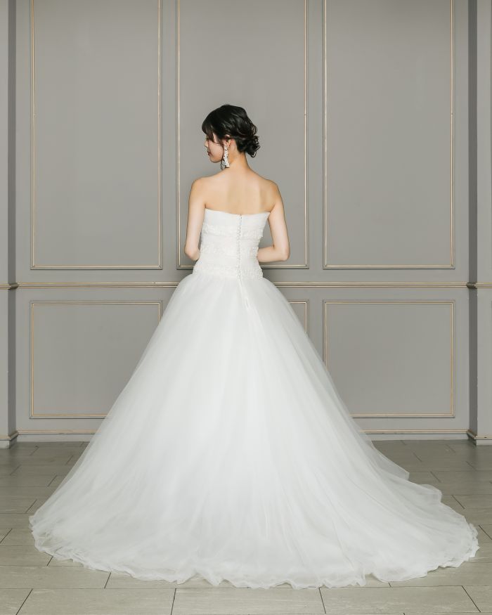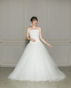 シンプルながらも印象に残る、気品あふれるモダンなウエディングドレス。胸元のチュールスリーブが、上品で大人の華やかさを演出します。