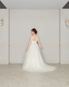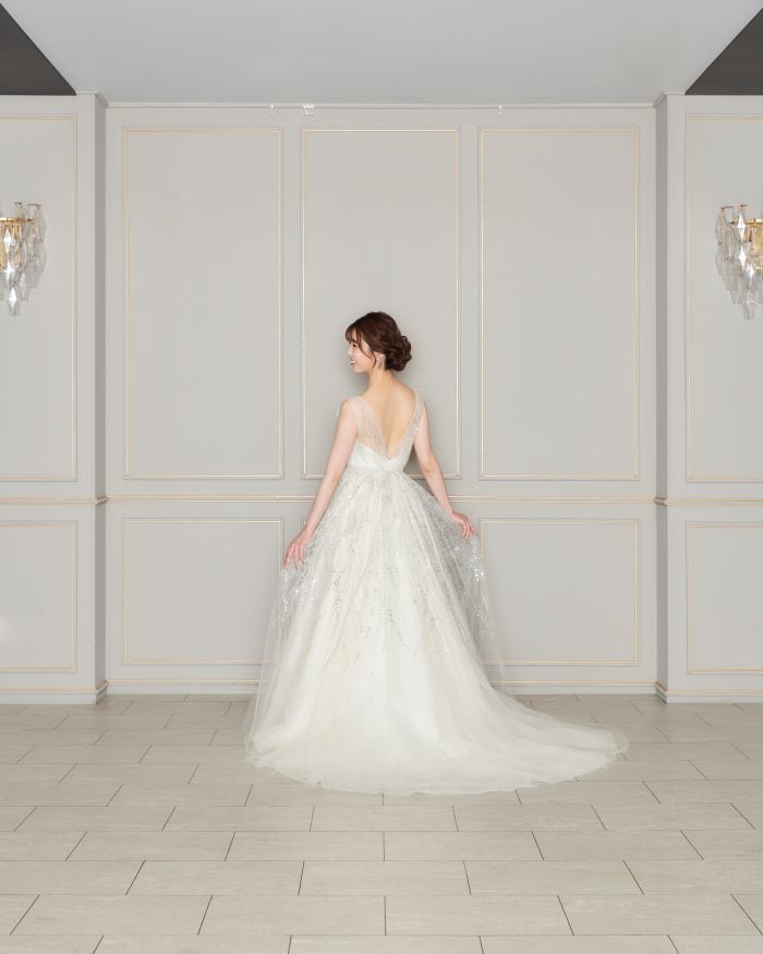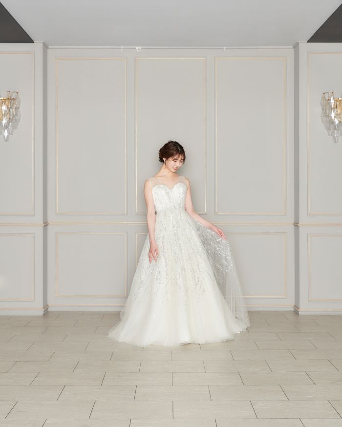 シルバーのグリッターデザインは、動くたびにキラキラと存在感を放ち、ライトや自然光の中で映える一着。ウエストのホワイトグレーのベロアリボンがポイントとなり、披露宴のカジュアルな雰囲気にも相性抜群です。
