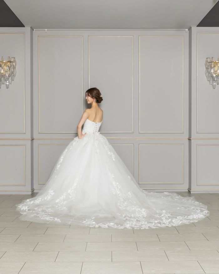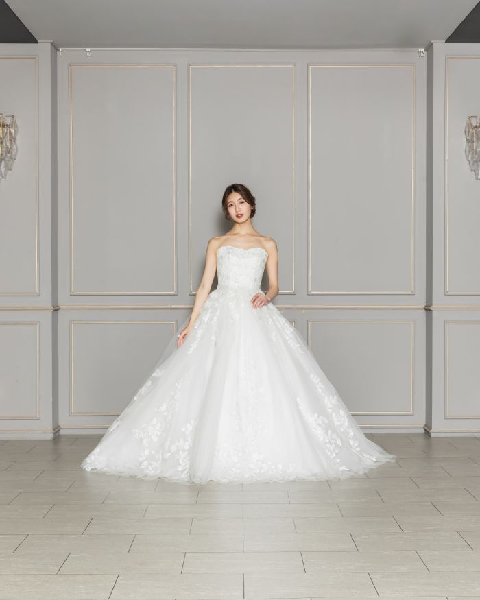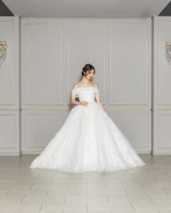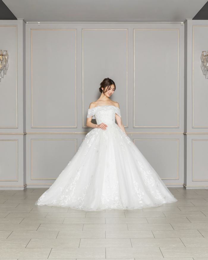 リーフモチーフの刺繍をあしらったドレスは気品と上質さを与え、透け感のあるロングトレーンは挙式会場に映えること間違いなし。デコルテを美しく魅せるオフショルダーは、女性らしいラインを引き立てます。