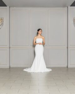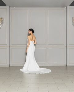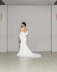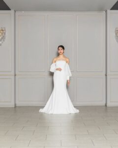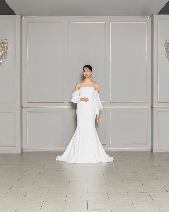 シンプルなデザインに女性のシルエットが引き立つマーメイドドレス。お取り外し可能なお袖を付けると女性らしい優雅さを演出します。