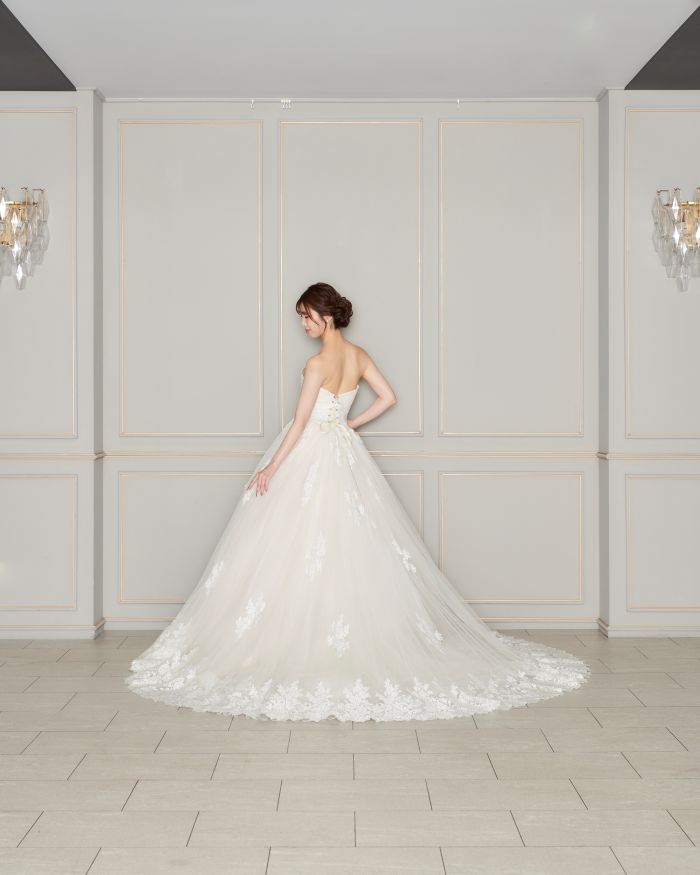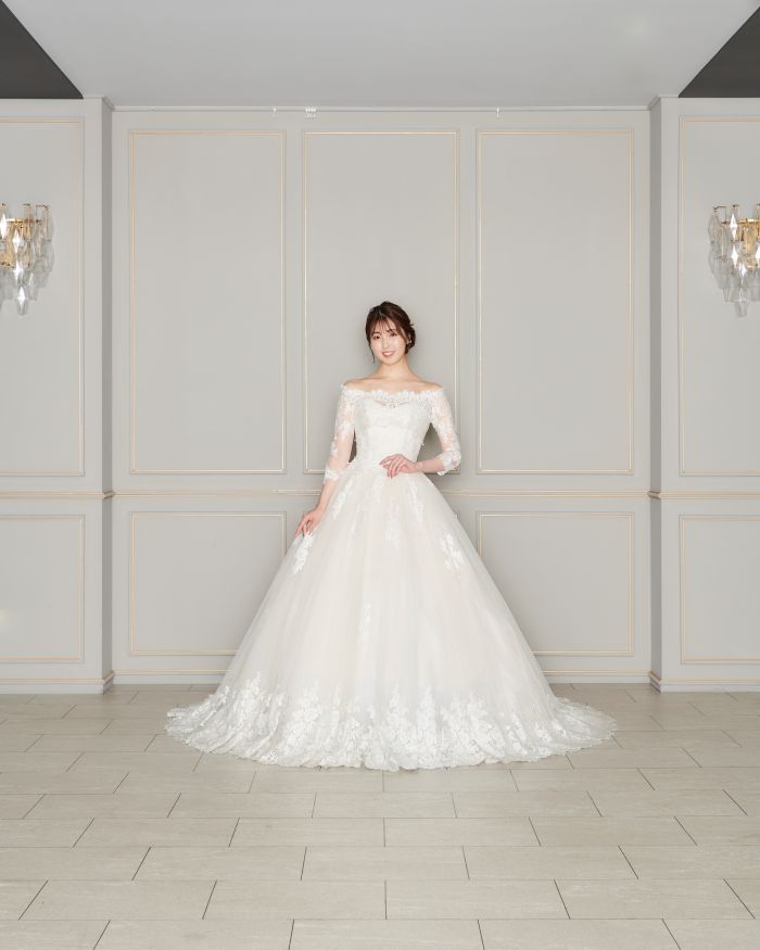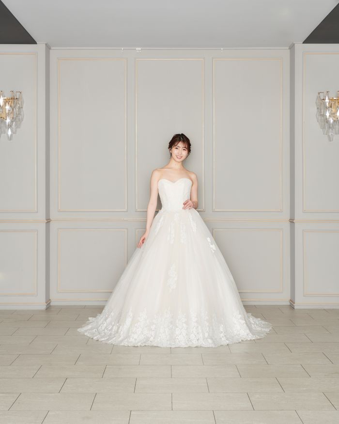 クラシカルでありながら、ナチュラルで可愛らしいデザイン。胸元のハートカットはデコルテを美しく見せ、やわらかさと気品さを演出します。取り外し可能なロングスリーブを付けるとさらに華やかに。