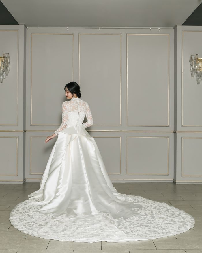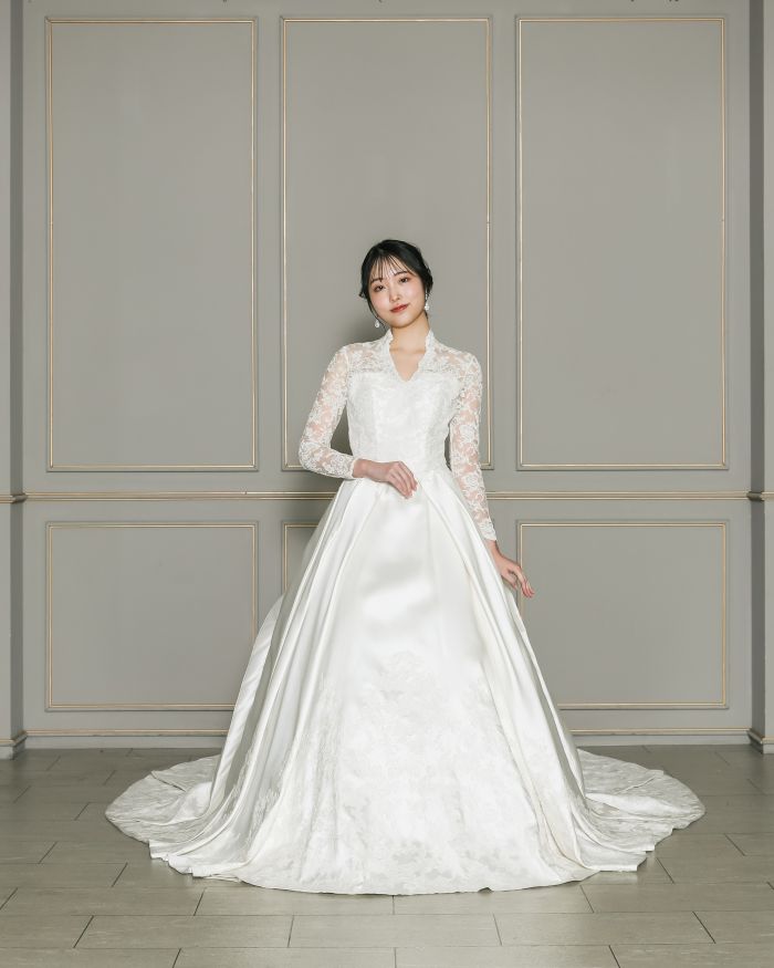 シンプルながらも、美しいレースに花の刺繍がほどこされたクラシカルなデザイン。肌の露出を控えたロングスリーブは、気品あふれる印象に。