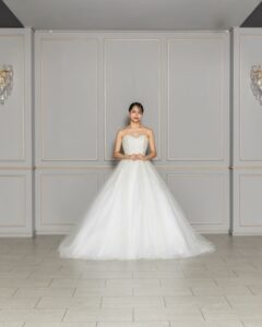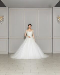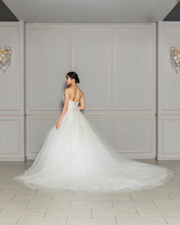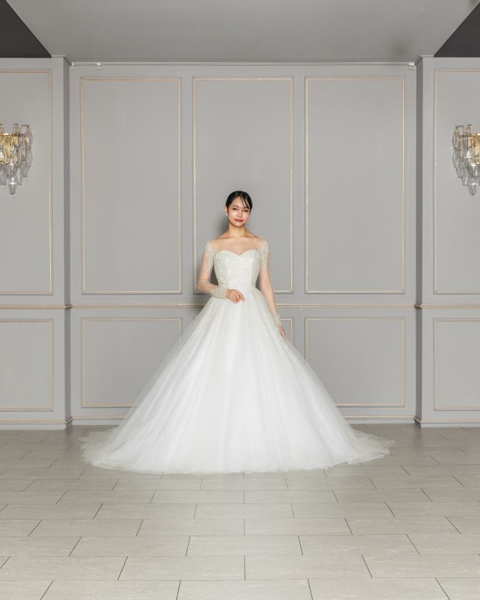 動くたびに繊細なキラキラ感が協調され、女性らしい華やかさを引き立てます。ロングスリーブは取り外し可能で、挙式や披露宴でも活躍する一着。誰もが目を止める美しいAラインドレスです。