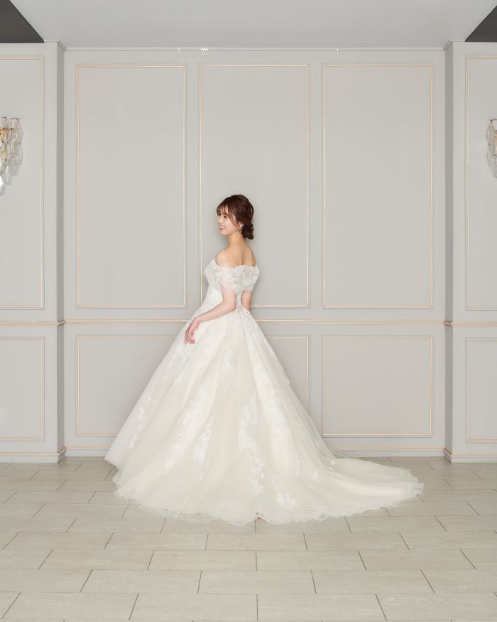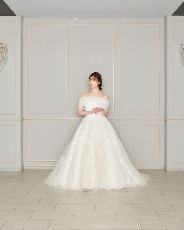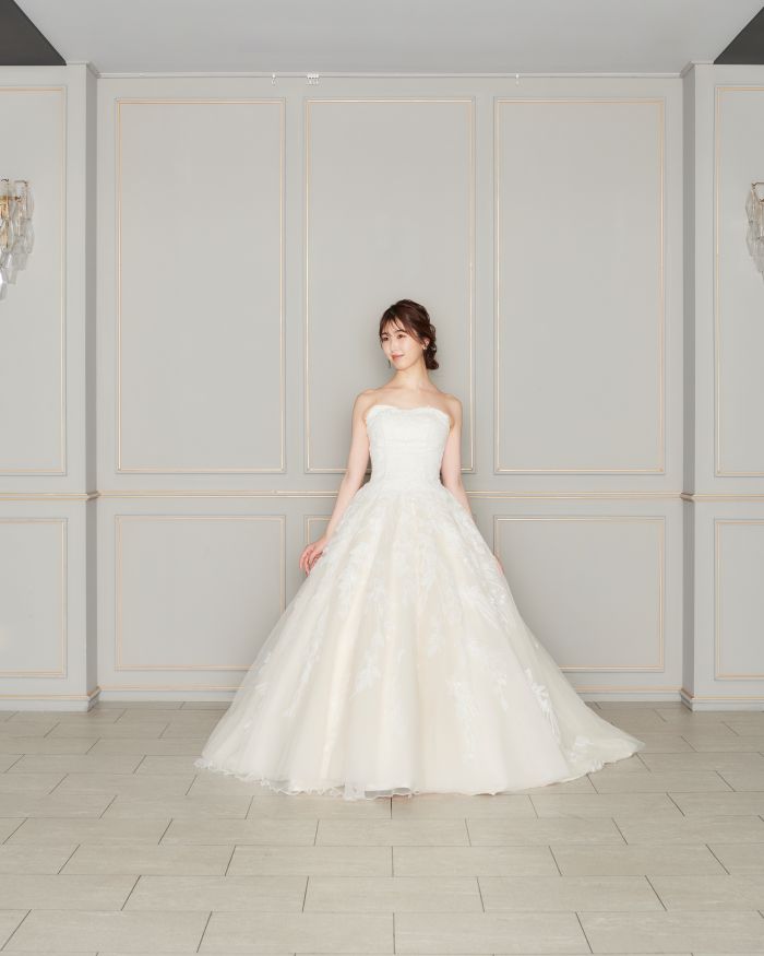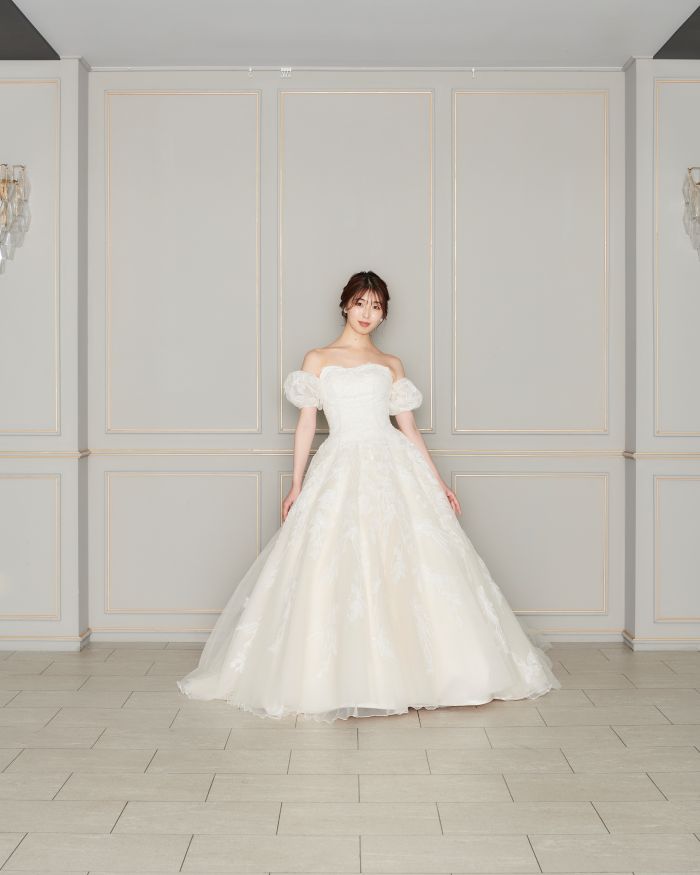 淡いピンクベージュの生地にスパンコールを施したリーフのデザインでナチュラルキュートなドレス。2種類の袖で上品さと可憐さを兼ね備えた贅沢な1着です。