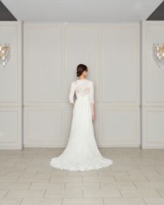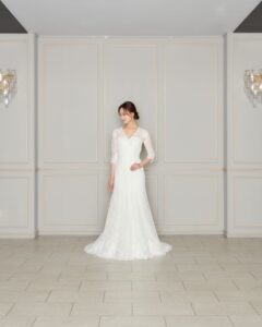 きめ細やかな刺繍の上品なソフトマーメイドドレス。上品な七分丈のスリーブに首元がすっきりと見えるVネックで優美な大人の花嫁様を演出。